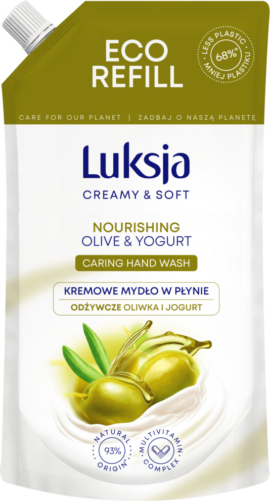 Kremowe mydło w płynie Luksja Oliwka i Jogurt łagodnie oczyszcza i pielęgnuje dłonie podczas każdego mycia. Delikatna formuła zawiera oliwę z oliwek i jogurt, oferujące skórze odżywienie i miękkość. Została wzbogacona o glicerynę, która wykazuje doskonałe działanie pielęgnujące.