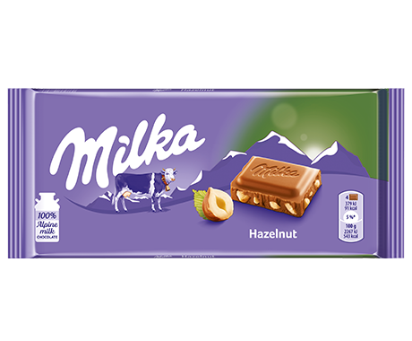 Czekolada mleczna z mleka alpejskiego z kawałkami orzechów laskowych.