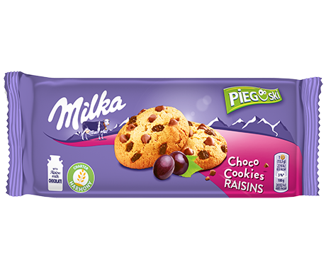 Ciasteczka z kawałkami czekolady mlecznej z mleka alpejskiego (22%) i rodzynkami (6,5%).