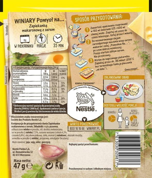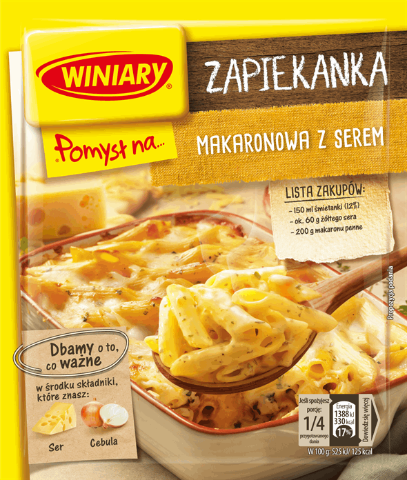 Skład: mąka pszenna, odtłuszczone mleko w proszku sól, skrobia ziemniaczana, ser w proszku (z mleka) 7,5%, suszone warzywa (cebula 4,3%, czosnek 0,8%), aromat (z mlekiem), olej słonecznikowy,zioła, aromat (z mlekiem), ekstrakt drożdży, serwatka w proszku (z mleka), emulgator (lecytyny), przyprawy, emulgator (lecytyny)