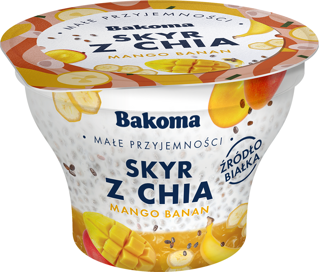 Skyr Bakoma z nasionami chia o smaku mango i banana – to pyszny sposób na dostarczenie sobie energii. Gęsta konsystencja jogurtu i chrupiące nasiona chia sprawiają, że to przekąska, która nie tylko smakuje, ale także syci na długo!